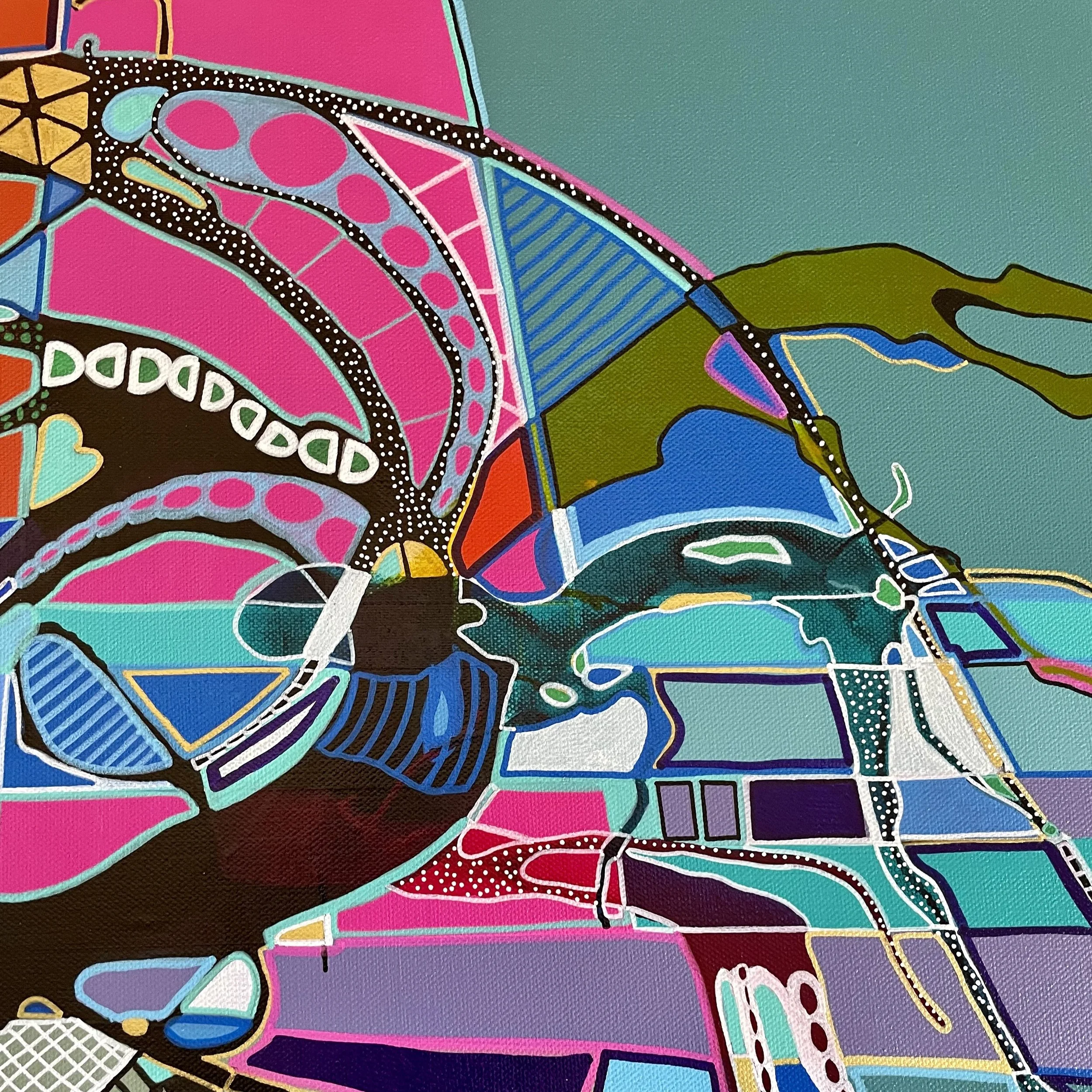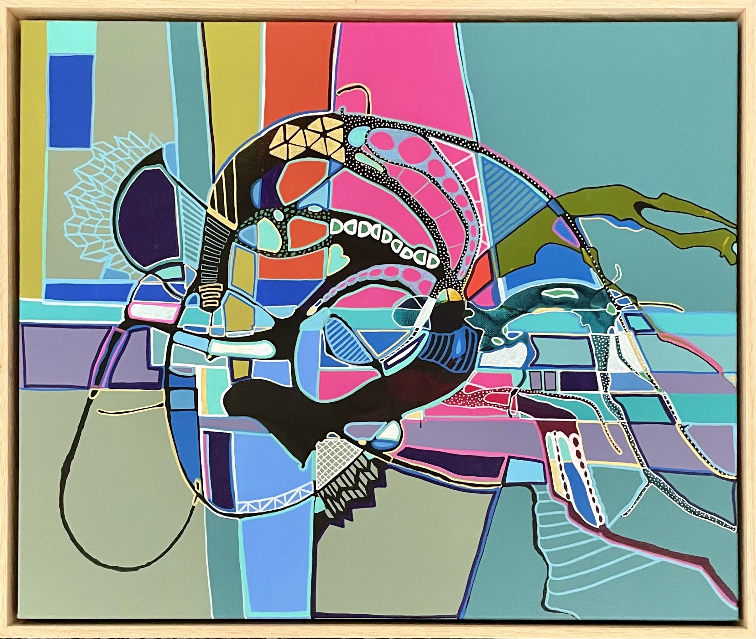 64.5cm x 54.5cm, Acrylic ink and acrylic paint on canvas, finished with gloss varnish, floating frame (oak).