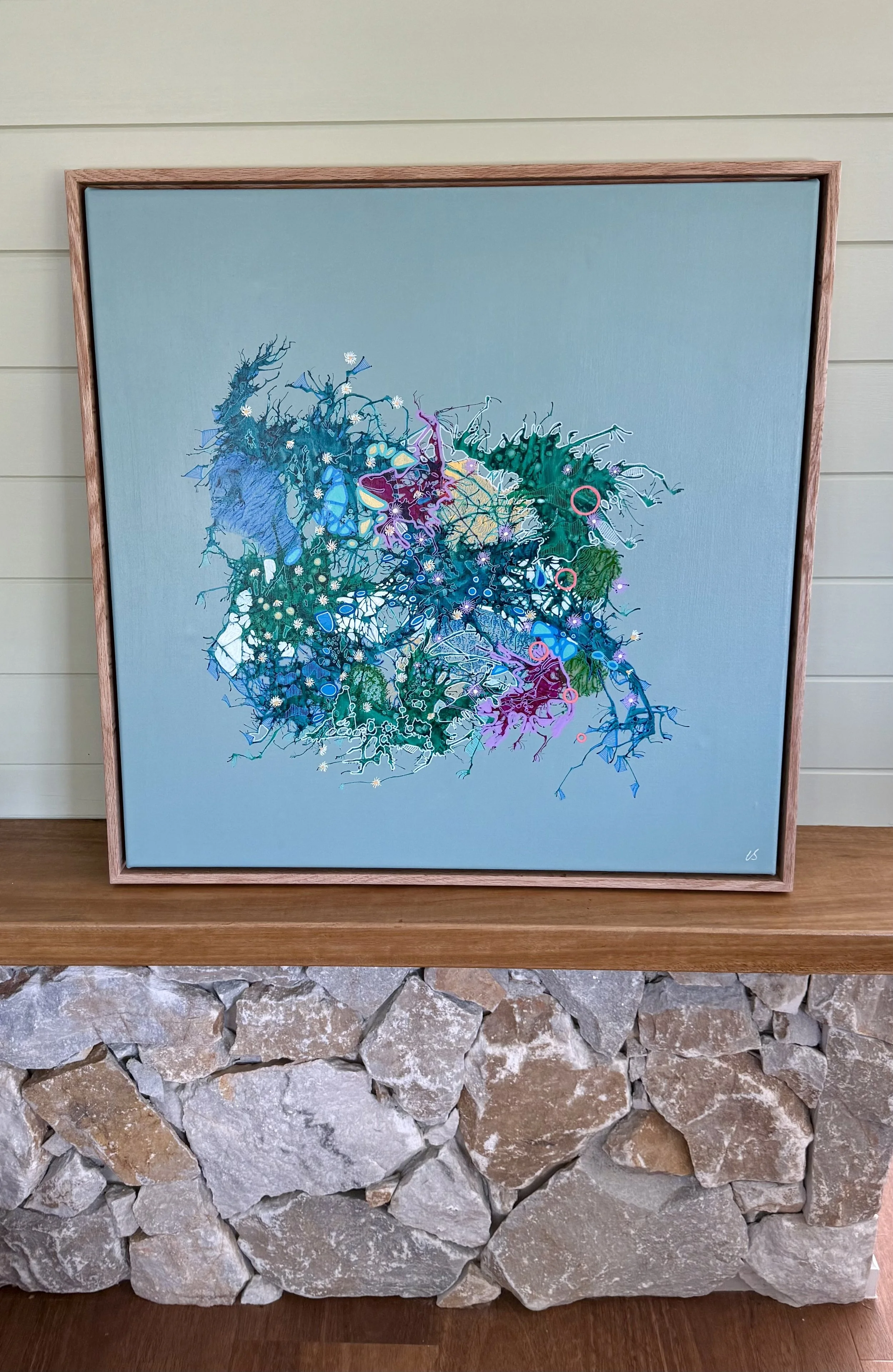 63.5cm x 63.5cm, Ink and acrylic on canvas, framed (oak).